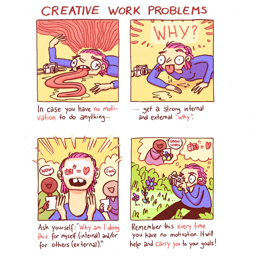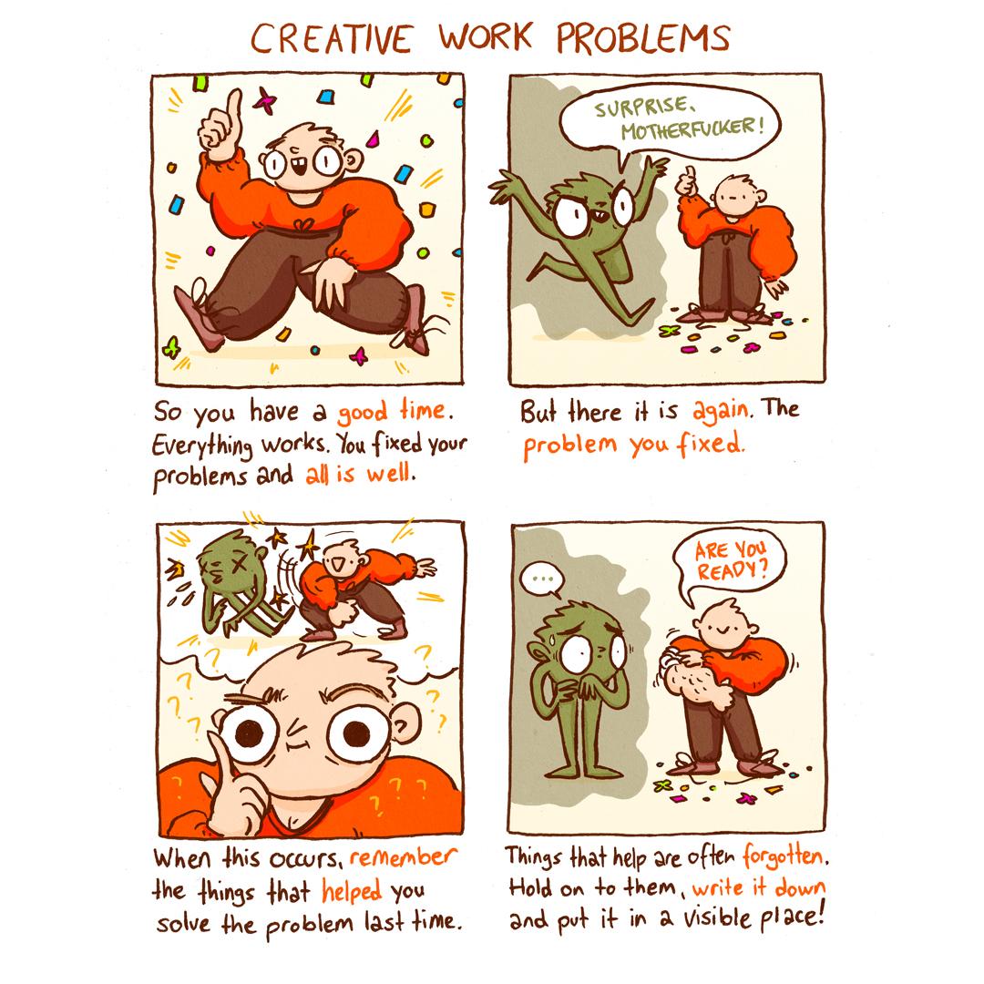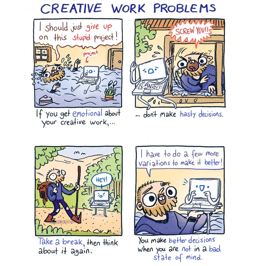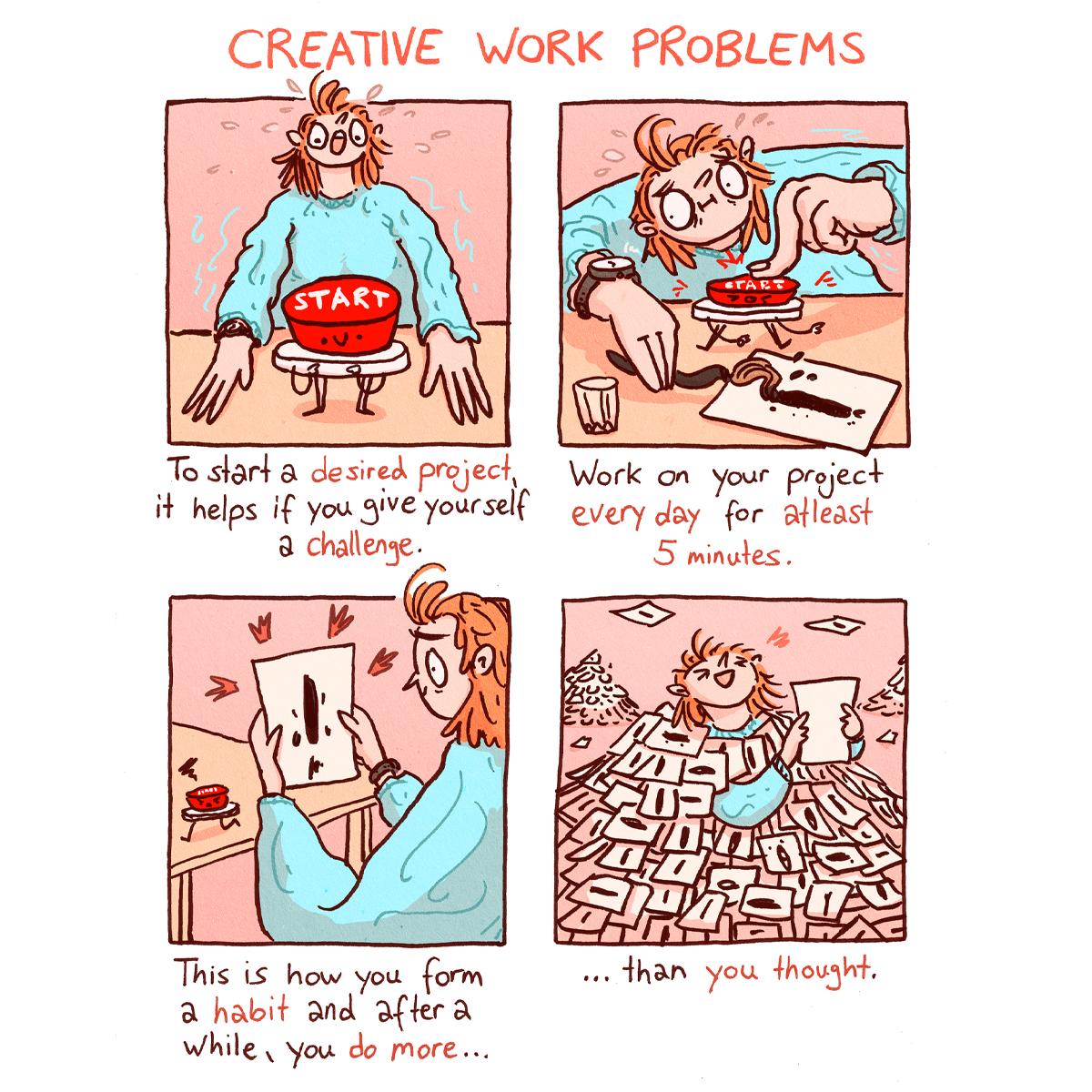 Beschreibung:Creative Work Problems“ war eine wöchentliche Comicserie über die Probleme, mit denen Künstler und Designer täglich konfrontiert werden. Sie sollte lustig, niedlich und hilfreich für Menschen sein, die Probleme mit ihrer kreativen Arbeit haben.