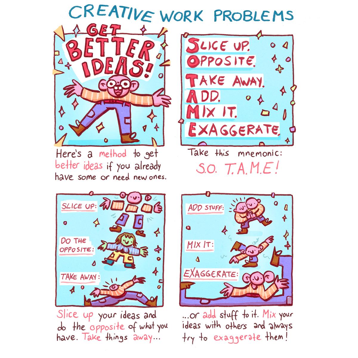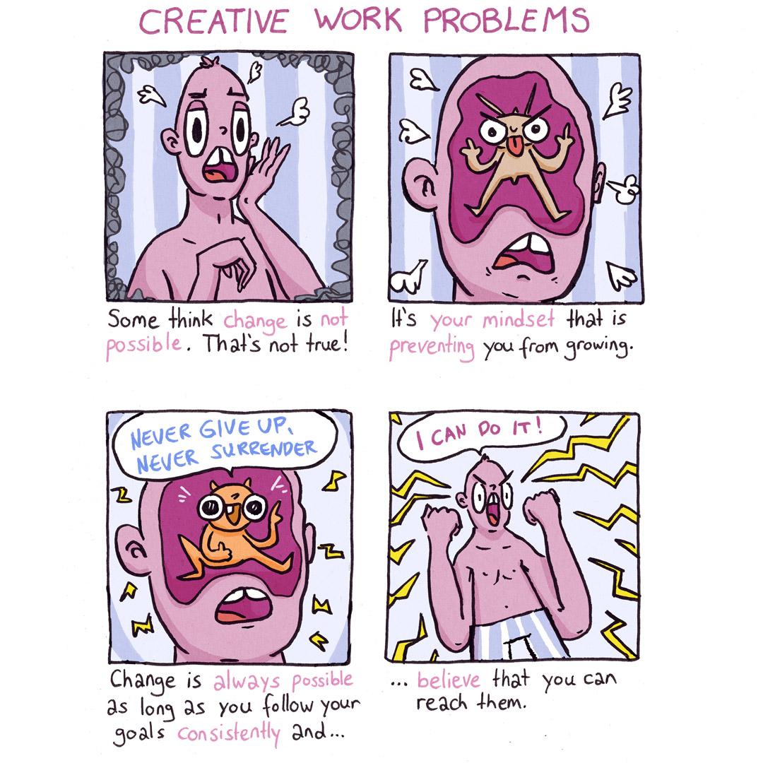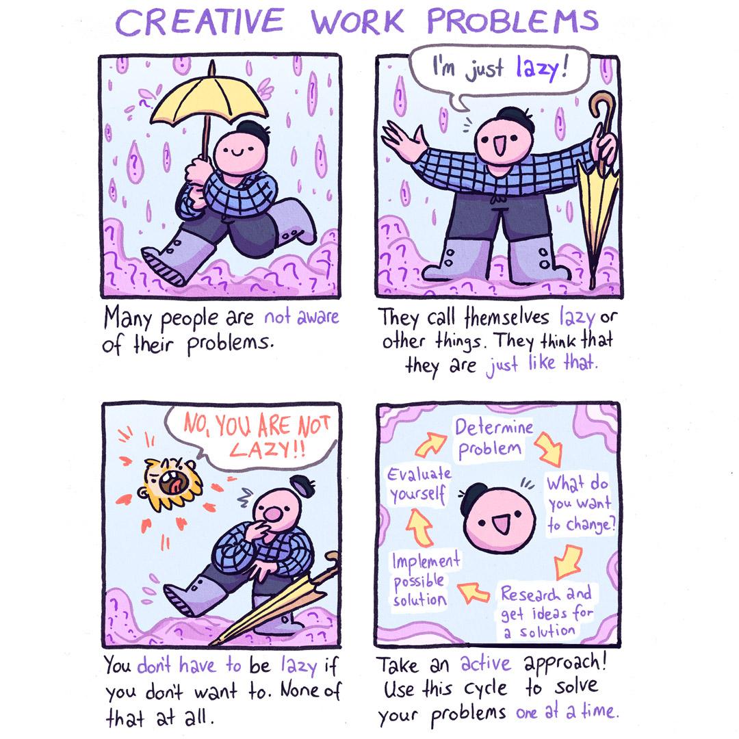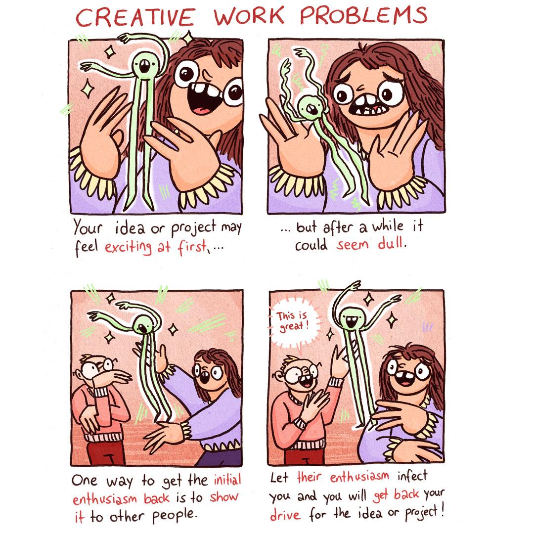 Beschreibung:Creative Work Problems“ war eine wöchentliche Comicserie über die Probleme, mit denen Künstler und Designer täglich konfrontiert werden. Sie sollte lustig, niedlich und hilfreich für Menschen sein, die Probleme mit ihrer kreativen Arbeit haben.