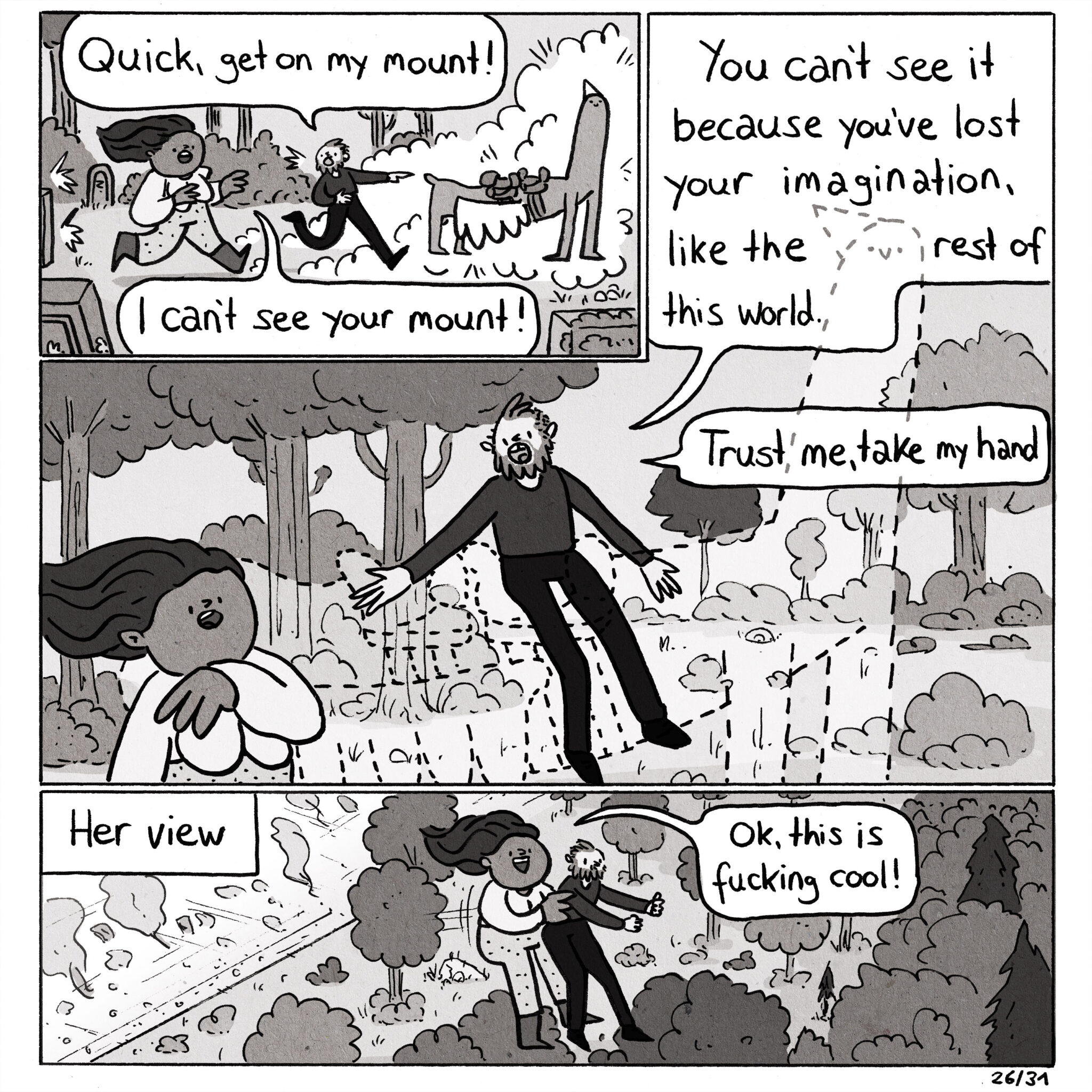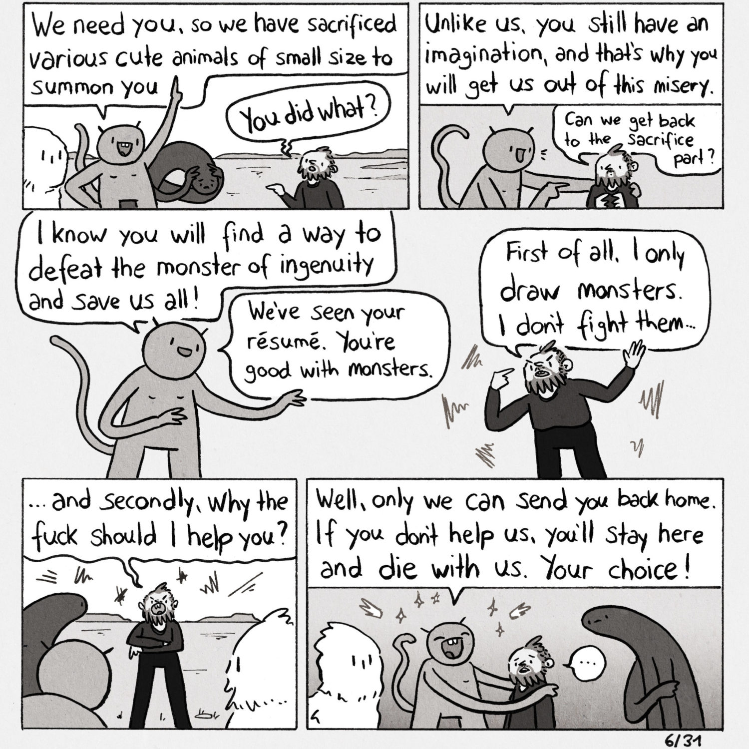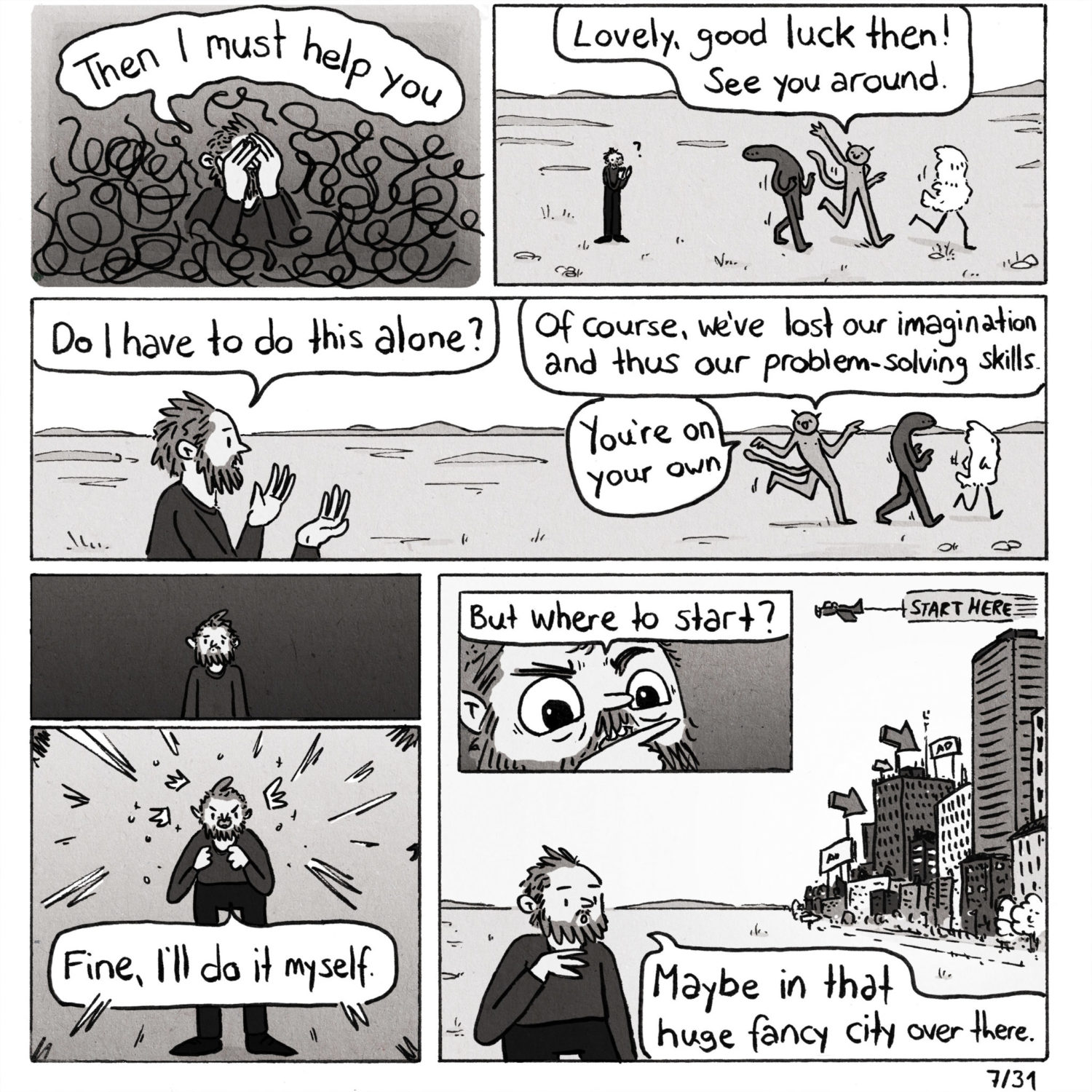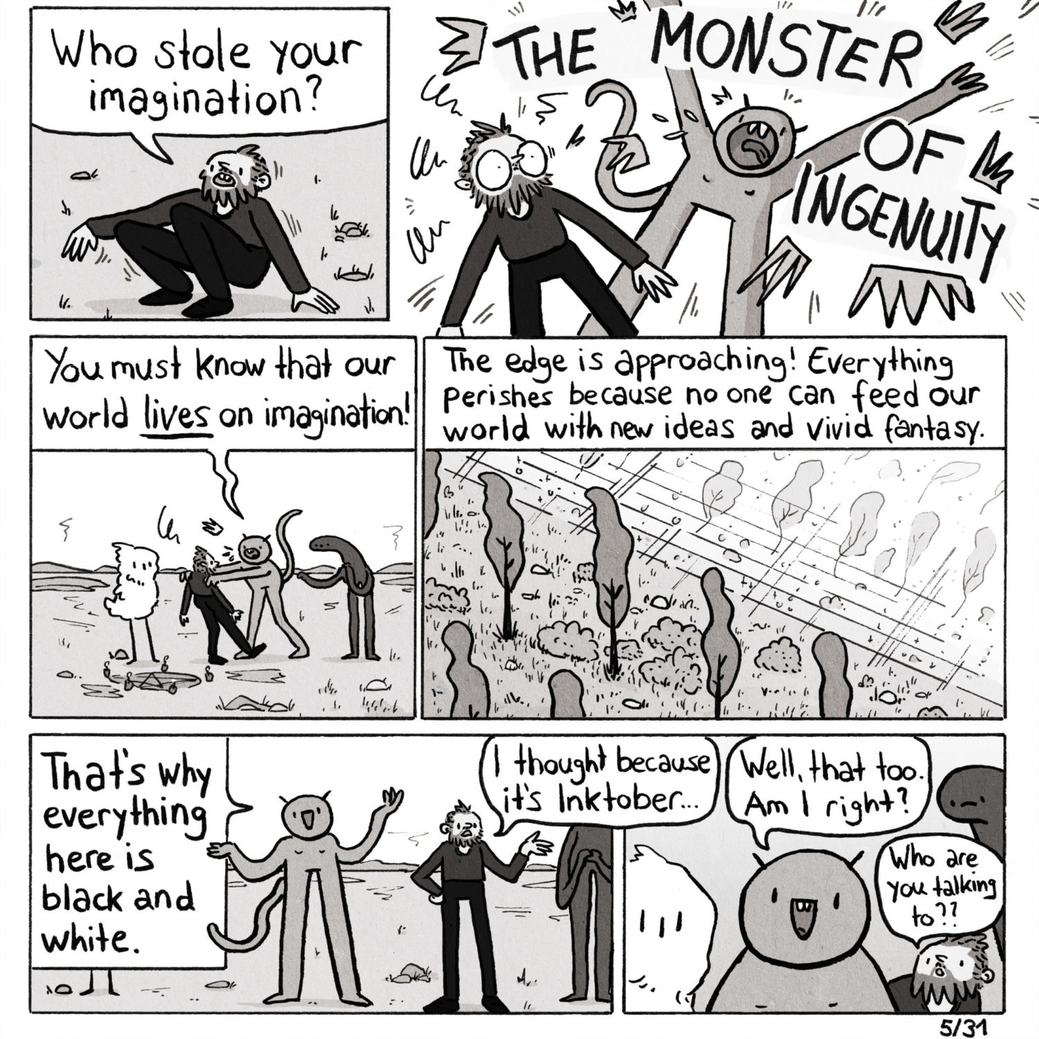 Beschreibung: „The Stolen Imagination“ ist ein absurder Comic über eine Welt, die von der Fantasie lebt. Während Inktober entstand jeden Tag eine Seite.