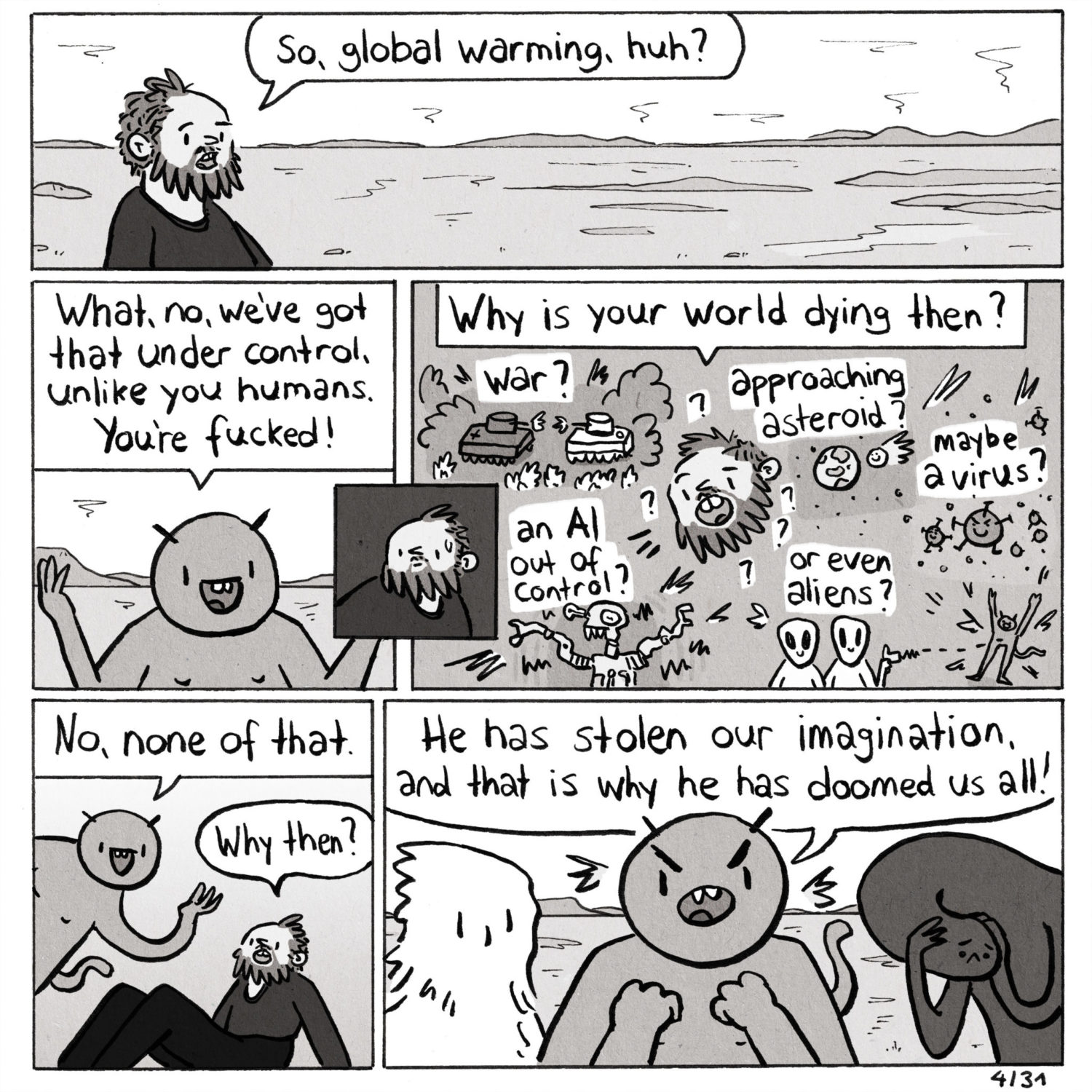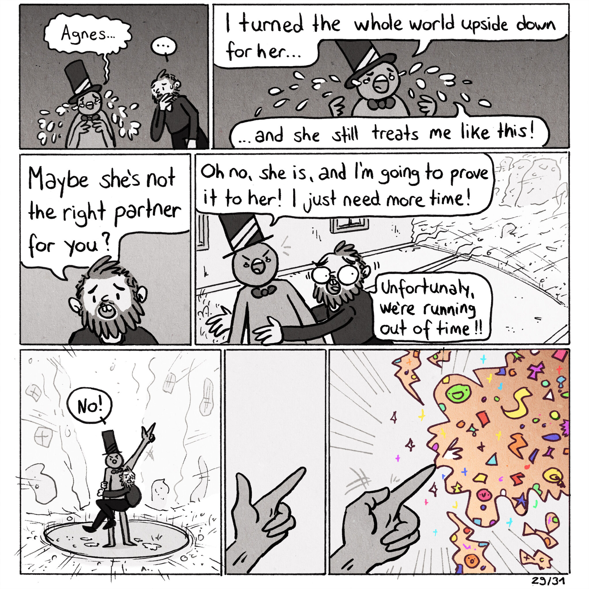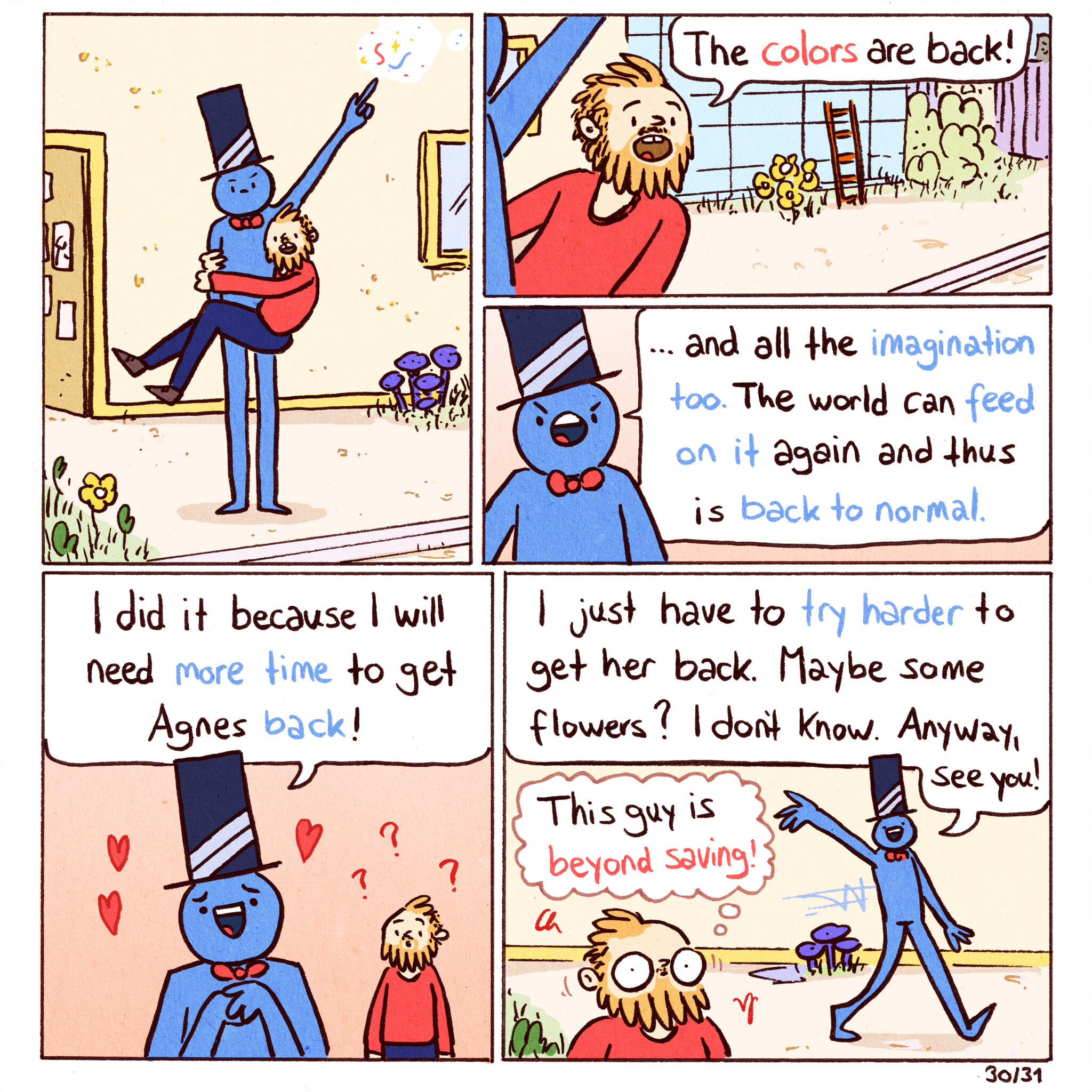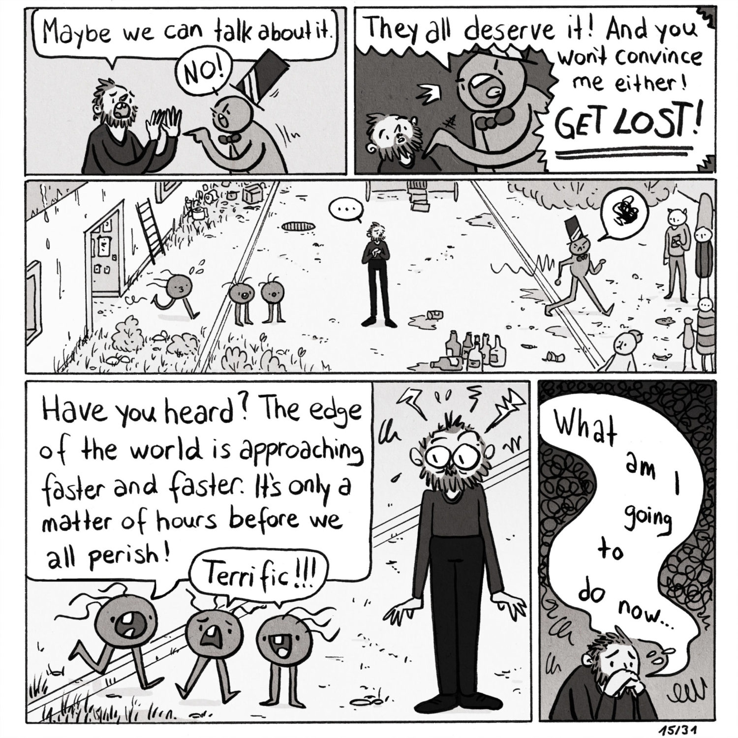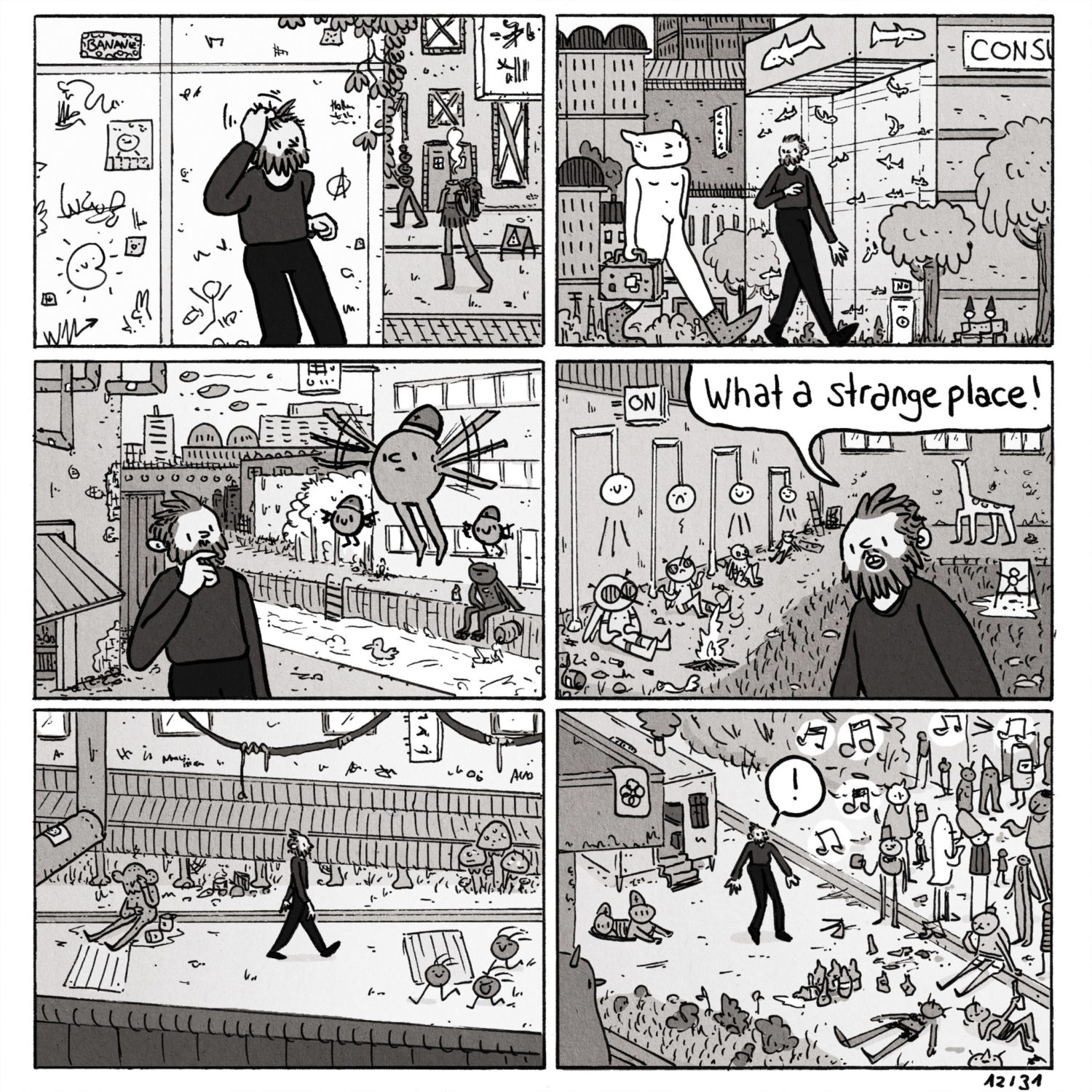 Beschreibung: „The Stolen Imagination“ ist ein absurder Comic über eine Welt, die von der Fantasie lebt. Während Inktober entstand jeden Tag eine Seite.