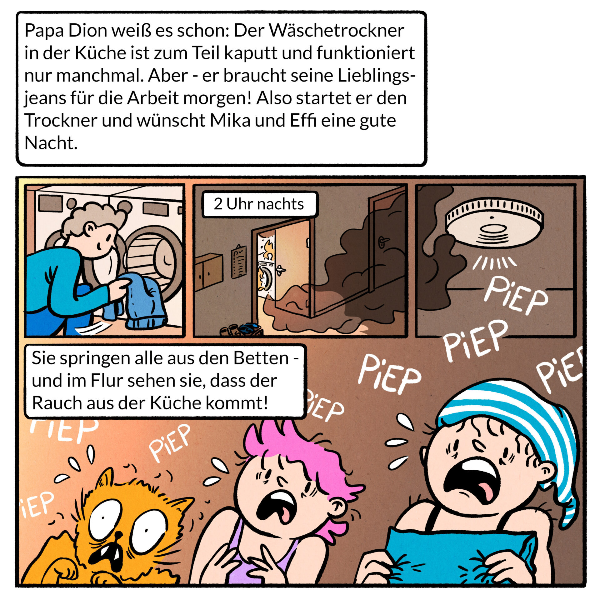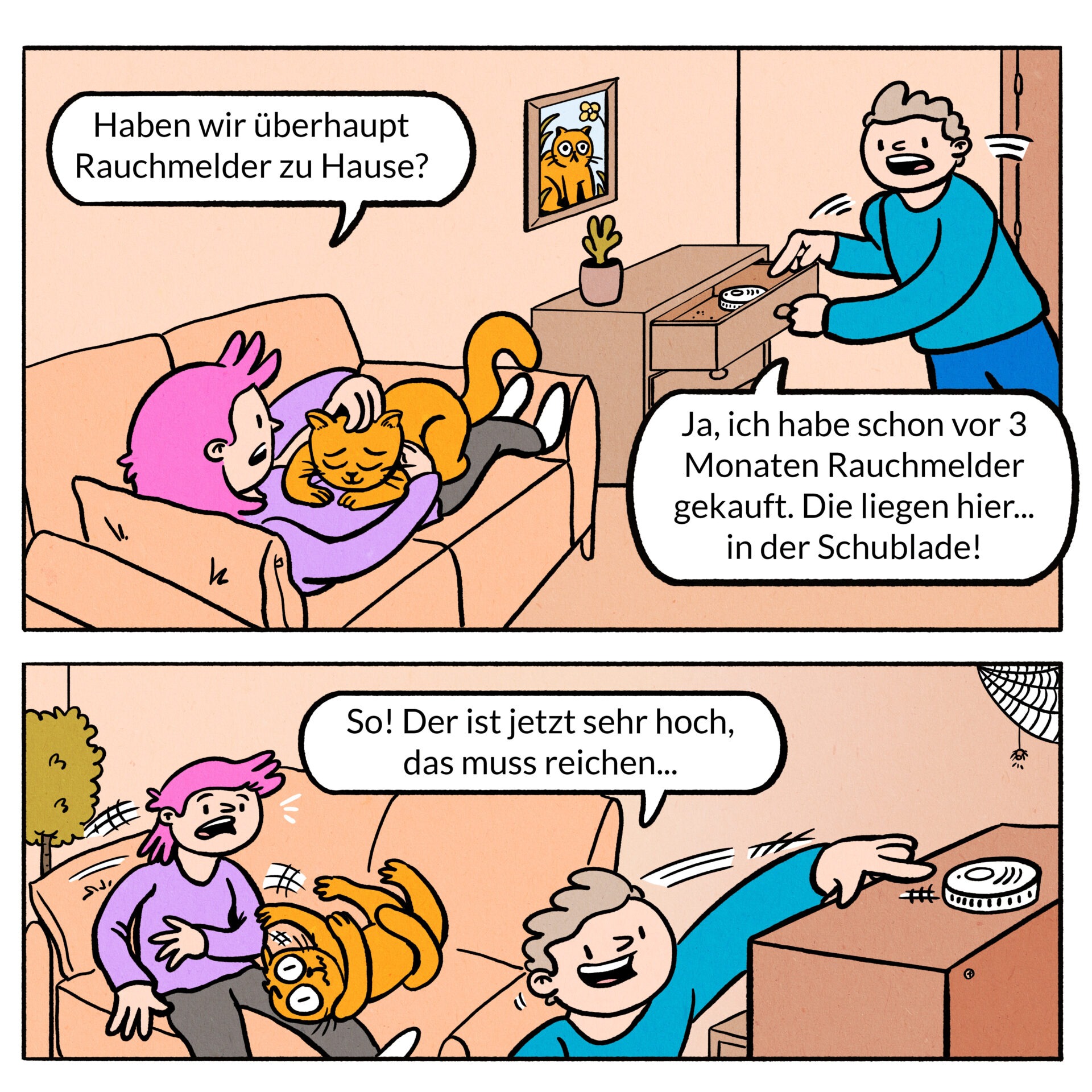 Beschreibung: Für die Aufklärungskampagne „Rauchmelder retten Leben“ durfte ich Illustrationen für ein unterhaltsames Online-Quiz im Comicstil erstellen. Das Ziel bestand darin, richtiges Verhalten im Zusammenhang mit Rauchmeldern auf spielerische Weise zu vermitteln. Das Quiz richtet sich an ein breites Publikum und nutzt humorvolle Szenarien, Meme-Ästhetik sowie drei wiederkehrende Comicfiguren, um Wissen auf emotionale und leicht verständliche Weise zu vermitteln.